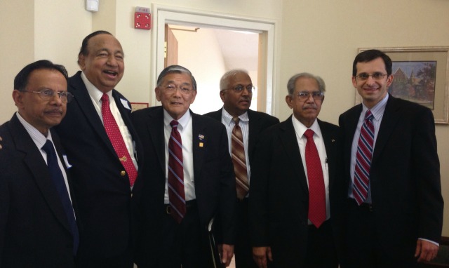 | Some of the participants with Hon. Norman Mineta, Chief guest at the conference. (From left- Mr. Pious Thattassery, Dr. Sambhu Banik, Hon. Mineta, Mr. Sunny Wycliffe, Dr. Parthasarthy Pillai,& Mr. Chad Tragakis. |
